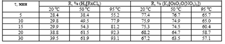 Таблица 1 Зависимость степени извлечения рутения(IV) из раствора H2[RuCl6] и осмия(VI) из раствора К2[OsO2О(NO2)2] кремнеземом ДТКС от времени контакта фаз и температуры. СМе = 100 мкг/мл, 0, 1 г сорбента
