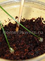 Когда у молодой луковки станут различимы зачатки корней, ее можно поместить в отдельный горшок-тепличку, положив донцем на поверхность субстрата. Необходимо следить за тем, чтобы фрагмент чешуи не стал источником гнили.