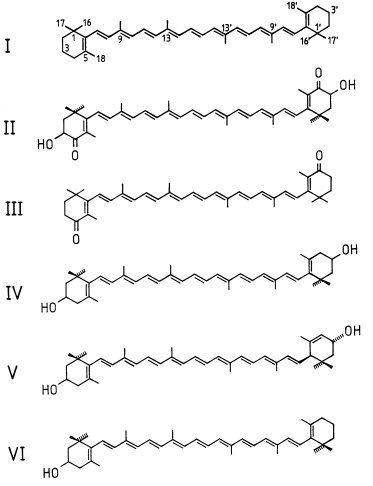 Структурные формулы некоторых каротиноидов. I — бета-каротин, II — астаксантин, III — кантаксантин, IV — зеаксантин, V — лютеин, VI — бета-криптоксантин