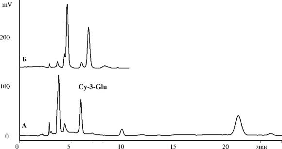 Сложный состав антоцианового комплекса подтверждают результаты ВЭЖХ исследований (рис. 2). На хроматограмме идентифицируется сравнением с хроматограммой смородины черной цианидина-3-глюкозид. Однако довольно значительно содержание быстрее элюирующихся компонентов, имеющих дигликозидную структуру и более сильно удерживаемых компонентов, возможно, ацилированных производных.