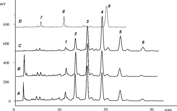 Для исследования каротиноидов и антоцианов методом обращенно-фазовой ВЭЖХ использовали хроматографическую систему, составленную из насоса Altex 110A, крана- дозатора Rheodyne 7100 с петлей объемом 20 мкл, детектора LC/9563 Nicolet, длина волны детектирования440нм(приопределениикаротиноидов)и