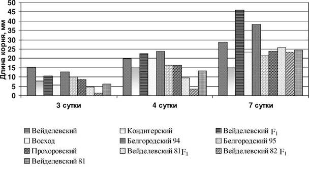 Наиболее интенсивный рост отмечен у гибрида Вейделевский: длина корня на 7-е сутки составила 45,8 мм, длина стебля - 34,3 мм. На втором месте по интенсивности роста - сорт Белгородский 94, на третьем - Вейделевский.