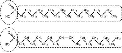 Рис . 1. Структурная формула насыщенной стеариновой кислоты 18:0 (вверху) и мононенасыщенной олеиновой кислоты 18:1n-9 (внизу)