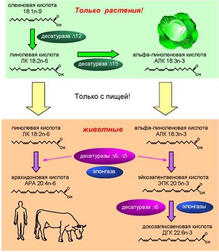 Рис. 3. Схема синтеза полиненасыщенных жирных кислот у растений и животных
