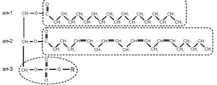 Рис. 4. Структурная формула молекулы фосфолипида: в положении sn-1 изображена стеариновая кислота (как на рис. 1), а в положении sn-2 - длинноцепочечная полиненасыщенная арахидоновая кислота (АРК, 20:4n-6). Головная группа R в положении sn-3 может быть представлена атомом водорода, спиртами и некоторыми другими веществами