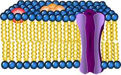 Рис. 5. Пространственная модель клеточной мембраны. Фосфолипиды имеют синюю «головку» и два жирнокислотных «хвоста». Также в мембрану включены белковые глобулы