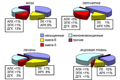 Жирнокислотный состав фосфолипидов клеток разных органов и тканей существенно различается (рис. 6). Как правило, чем сложнее функция органа, тем больше длинноцепочечных ПНЖК содержится в клетках тканей, составляющих данный орган. Например, в клетках серого вещества коры головного мозга здорового человека содержится 13 % ДГК и 9 % АРК, а содержание ДГК в сетчатке достигает 20 %, это наивысшее значение для человеческого тела (рис. 6). В то же время в ади- позной (жировой) ткани, которая состоит не из фосфолипидов, а из запасных жиров - тригли- церинов, содержится менее 1 % ДГК (рис. 6).