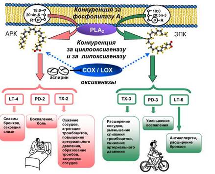 Важнейшая физиолого-биохимическая роль двух других длинноцепочечных ПНЖК, АРК и ЭПК, состоит в том, что они биохимические предшественники синтеза эндогормонов - эйкозаноидов (SanGiovanni, Chew, 2005). Синтез эндогормонов (рис. 7) начинается с высвобождения ПНЖК из фосфолипидов клеточных мембран под действием особого фермента - фосфолипазы А2 (обозначаемой латинскими буквами PLA2). Эта фосфоли- паза A2 способна отщеплять именно ПНЖК, находящуюся в молекуле фосфолипида в положении sn-2 (рис. 4). Затем другие ферменты, циклооксигеназы (COX), синтезируют из свободных ПНЖК простагландины (PG) и тромбоксаны (TX), а липоксигеназы (LOX) синтезируют лейкотриены (LT) (рис. 7). Важно отметить, что из арахидоновой кислоты синтезируются в основном простагландины и тромбоксаны так называемой второй серии, т.е. имеющие две двойные связи и обозначаемые PG-2 и TX-2 соответственно, а также лейкотриены четвёртой серии LT-4. TX-2 вызывают сужение кровеносных сосудов, усиливают агрегацию (слипание) тромбоцитов. Чрезмерная агрегация тромбоцитов приводит к повышению артериального давления, образованию тромбов и закупорке сосудов (рис. 7). PG-2 запускают воспалительный процесс и индуцируют боль. LT-4 вызывают спазмы бронхов и секрецию слизи (рис. 7). Из эйкозапентаеновой кислоты получаются эндогормоны, обладающие противоположными свойствами, чем производные АРК (Simopoulos, 2000). Из ЭПК синтезируются простагландины и тромбоксаны третьей серии (с тремя двойными связями), PG-3 и TX-3, и лейкотриены пятой серии LT-5 (рис. 7). TX-3 вызывают расширение кровеносных сосудов, препятствуют слипанию тромбоцитов и тем самым снижают артериальное давление. PG-3 обладают противовоспалительным эффектом (Wall et al., 2010), а LT-5 являются антиаллергенами и расширяют бронхи (рис. 7).