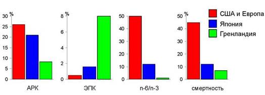 Итак, из современных биохимических данных следует, что в организме человека, во-первых, должно содержаться достаточное количество омега-3 ПНЖК. Во-вторых, соотношение омега-6 и омега-3 кислот тоже имеет важнейшее значение для кровеносной системы. Эти показатели тесно связаны со смертностью от сердечно-сосудистых заболеваний. Например, у населения США и Европы в клетках крови (тромбоцитах) содержание арахидоновой n-6 кислоты почти в три раза выше, а содержание n-3 эйкозапентаено- вой кислоты в 16 раз ниже, чем у эскимосов Гренландии (рис. 9). Соотношение n-6:n-3 у населения этих стран различается в 50 раз, и смертность от сердечно-сосудистых заболеваний в США и Европе почти в 7 раз выше, чем в Гренландии (рис. 9). Население Японии, занимающее по показателям количества и соотношения n-6 и n-3 ПНЖК в крови промежуточное положение, имеет и промежуточное значение смертности от сердечно-сосудистых заболеваний: около 12 % от общей смертности по сравнению с 45 % в США и 7 % в Гренландии (рис. 9).
