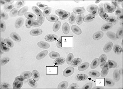 Периферическая кровь петухов, увеличение х1600 1- ретикулоцит 1 класса, 2 - ретикулоцит 2 класса, 3 ретикулоцит - 3 класса.