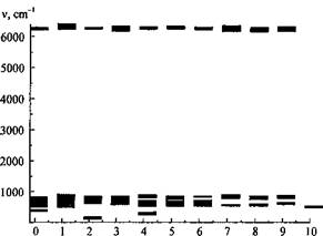 Количество мостиковых оловых связей и концевых ОН-групп резко возрастает с увеличением степени полимеризации. Расчет подтверждает, что в области до 1000 см-1 колебания этих связей очень чувствительны к окружению. В высокочастотной области спектра (выше 6000 см-1) влияние окружения на оловые мостиковые связи снижается (см. рис. 3). Полосы в интервале 6200-6400смч, соответствующие колебаниям концевых ОН- групп, завершают высокочастотную область расчетного спектра.