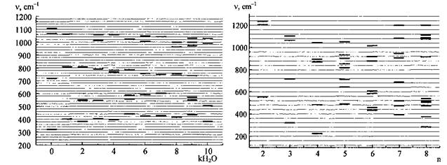 Рис. 1. Рассчитанные частоты колебаний мостиковых оксо-связей низкомолекулярных агрегатов цирконогелей с различной степенью гидратации (к) и полимеризации (п): а) рЮ(0Н)2]3кН20, б) рЮ(ОН)2]„