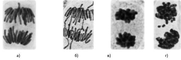 Рис. 2. Характерные типы хромосомных аберраций для красителей: б - множественные мосты и забегания хромосом, индуцированные Зеленым S (E142), и г - фрагментация хромосом, вызванная Тартразином (E102);