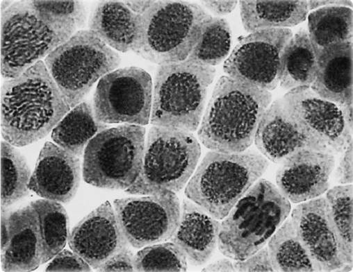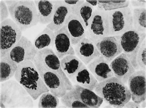Рис. 3. Появление сестринских микроядер (в двух центральных клетках) после воздействия на меристему пищевых красителей Зеленый S (E142) и Тартразин (E102)