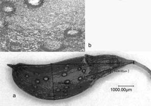 Образец №6 (Астрахань). Длина терминальных кистей соцветия достигает 10 см, а длина боковых кистей - 5-6 см. Число осей в соцветии (3 кисти) довольно постоянно. Среднее число плодов на одной кисти (99^29.0) и в одном соцветии (298.3±22.2; CV=13%) велико. На 1 см кисти сформировано ~9-10 плодов. Ось (рахис) соцветия сильно опушен длинными (0.55-0.69 мм) светлыми волосками. Поверхность бобов практически без опушения, на ней больше железок, в сравнении с предыдущими образцами. Трубка чашечки голая, с явно выраженными овальными железками (рис. 3 a); зубчики с ресничками по краю. Верхний зубец, хотя и вдвое уже остальных, ненамного различается от них по длине (0.6-0.5-0.4-0.4-0.4 мм) (рис. 4 а). Средняя длина боба (6.2 мм; CV= 6%) превышает диаметр (1.8 мм) в 3.4 раза.