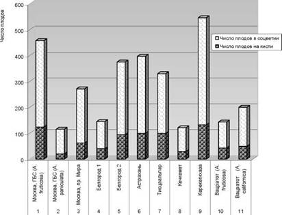 Рис. 2. Число плодов в 1 кисти и в соцветии в целом у различных образцов аморфы