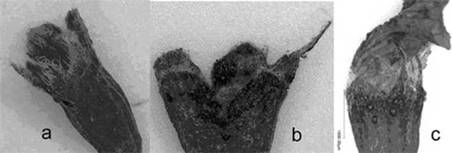 Рис. 4. Варианты соотношения зубцов чашечки: а) зубцы практически одинаковой длины (Астрахань); b) длинный узкий зубец и 4 коротких (ботсад МГУ); c) два длинных узких зубца и 3 коротких (ГБС РАН)