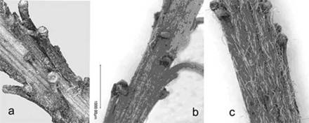Рис. 5. Варианты опушения оси соцветия у аморфы: а) практически голая (Белгород); b) рассеянное опушение (A. californica, Вацратот); с) сильно опушенная (Кечкемет)
