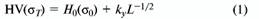 где HV — твердость, <зт — предел текучести, Н0 — твердость тела зерна, о0 — внутреннее напряжение, препятствующее распространению пластического сдвига в теле зерна, ky — коэффициент пропорциональности, L — средний размер зерна.