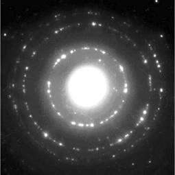 Рассмотрим некоторые особенности структуры полученных композитов. В образцах, полученных при спекании шихты, содержащей 15%(масс.) СоО, даже в микрообъемах не выявляется неалмазный углерод. На микроэлектронограммах от различных участков образцов видны единичные точечные отражения, которые могут быть отнесены к кобальту и(или) его соединениям (рис. 1).