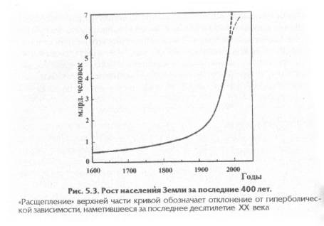Особенности роста. На протяжении многих тысячелетий народонаселение мира росло чрезвычайно медленно. Считается, что к началу IV- го тысячелетия до н.э. оно составляло около 100 млн., к 1000 году н.э. едва достигало 300 млн., а к 1500 году увеличилось до 425 млн. Такие темпы соответствуют годовому приросту максимум до 0,7°/оо, т.е. до семи человек на 10000 за год. Начиная с эпохи Великих географических открытий темпы роста народонаселения заметно возросли и приблизились к экспоненциальной закономерности. Но затем нарастание числа людей на Земле, прослеженное уже на основании достаточно достоверных исторических данных, приобрело еще более необычный характер, стало гиперболическим. В период с 1600 по 1990 гг. рост населения Земли довольно точно (с максимальным отклонением с5%) описывается эмпирическим уравнением гиперболы (рис. 5.3):