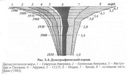 Вклад разных стран и континентов в общую картину роста народонаселения далеко не одинаков (рис. 5.4). По абсолютной численности самый большой прирост дали крупные азиатские страны — Китай, Индия, Индонезия; наибольшая скорость роста наблюдалась в Африке и Латинской Америке. В некоторых африканских странах относительный прирост доходил до 4% в год. В большинстве более развитых стран и регионов (Западная Европа, Северная Америка) ситуация демографического взрыва наблюдалась намного раньше — в XIX в. Для многих из них в настоящее время характерно развитие демографического перехода к стабилизации численности населения.