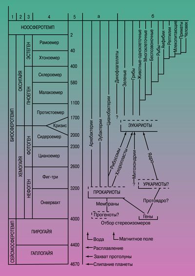 Справа — приблизительный механизм возникновения двух стволов жизни: а) доядерный, появившийся в результате генетической революции около 4 млрд лет назад (жизнь адаптирована к восстановительной среде); б) ядерный, появившийся в результате паразитического эндосимбиоза в условиях прерифейского глобального экологического кризиса 2 — 1,7 млрд лет назад (жизнь адаптирована к кислородной среде).