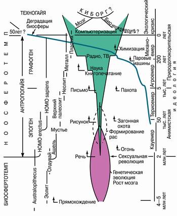 Справа — возрастающее давление разума на биосферу: ранний матриархат с анимистской идеологией (общество находилось в гомеостазе с биосферой); цивилизованный патриархат (общество, избрав природопокорительскую идеологию, обеспечило свой быстрый прогресс за счет возрастающей экспансии в природу и деградации последней). Тем самым общество закономерно привело себя и биосферу ко второму глобальному экологическому кризису, в результате которого биосфера заменяется техносферой и возникает третий — ноокибернетический — ствол жизни, адаптированный к любым некислородным средам, в том числе и к космической.