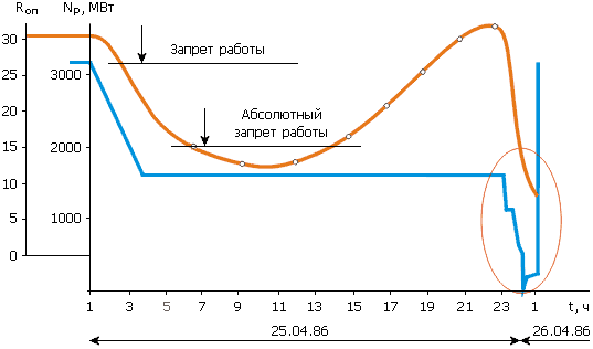 Рис. 1. Мощность (Np ) и оперативный запас реактивности (Rоп ) реактора 4-го блока на отрезке времени от 25.04.1986 до официального момента аварии 26.04.1986 [12] (овалом выделен предаварийный и аварийный отрезки времени)