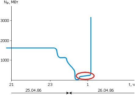 Рис. 2. Изменение мощности (Np ) реактора 4-го блока на отрезке времени от 23ч 00мин 25.04.1986 до официального момента аварии 26.04.1986 (увеличенный участок графика, обведённого овалом на рис.1). Обращает на себя внимание постоянный рост мощности реактора вплоть до самого взрыва
