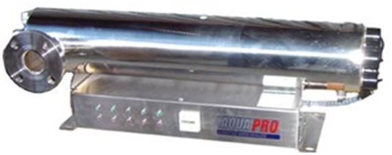 Ультрафиолетовый (УФ) стерилизатор «AquaPRO» - предназначен для безреагентного обеззараживания воды от патогенной микрофлоры (бактерии, споры, вирусы, простейшие) и обезвреживания токсинов и вредных органических соединений. Принцип действия основан на высокоинтенсивном импульсном облучении воды коротковолновым ультрафиолетовым излучением сплошного спектра в диапазоне длин волн 190-300 нм. В качестве источника ультрафиолетового излучения используется сверхмощная ксеноновая лампа, работающая в импульсно-переодическом режиме. Интенсивность бактерицидного излучения используемой лампы более чем в 100000 раз превышает интенсивность УФ излучения стандартных ртутных ламп.