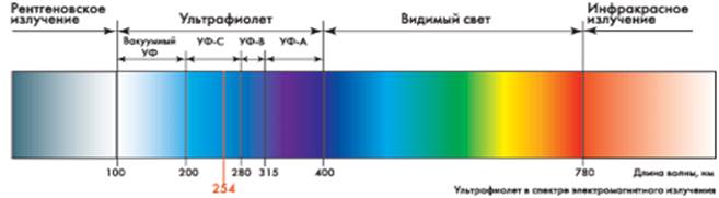 Для обеззараживания используется биологически активная область спектра УФ излучения с длиной волны от 205 до 315 нм, называемая бактерицидным излучением. Максимальная эффективность инактивации микроорганизмов наблюдается в диапазоне волн 250-270 нм, на этот участок спектра приходиться длина волны генерируемая УФ лампами низкого давления – 254 нм.