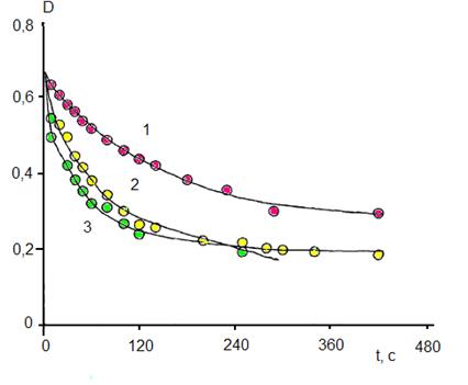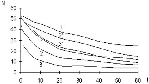 Рис. 1.1 - Зависимость мутности воды N (мг·л–1 ) от времени t (мин) при применении гидроксохлорида алюминия (1, 2, 3) и сульфата алюминия (1¢, 2¢, 3¢).