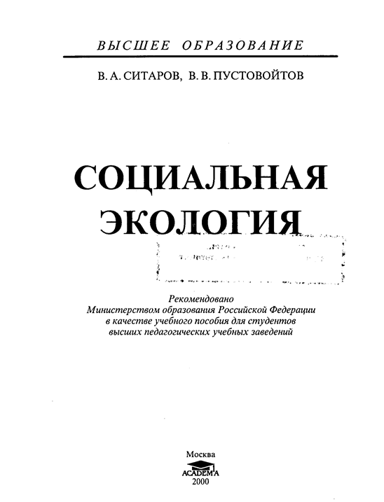 С 41 Социальная экология: Учеб. пособие для студ. высш. пед. учеб. заведений. - М.: Издательский центр «Академия», 2000. - 280 с.
