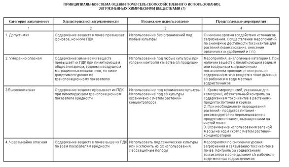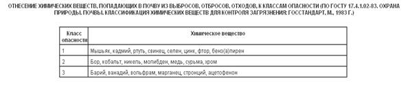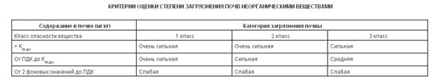 При загрязнении почвы одним веществом неорганической природы оценка степени загрязнения проводится в соответствии с таблицей 2 (27, 28) с учетом класса опасности компонента загрязнения, его ПДК и максимального значения допустимого уровня содержания элемента (Кmax) по одному из четырех показателей вредности (пункт 6.3).