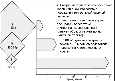 При больших дозах радиации начинают происходить необратимые реакции в костном мозгу, внутренних органах и нервной системе. При воздействии радиации более 30-40 Гр. смерть человека становится лишь делом времени. Из графика 1 видно, что большинство облученных погибают в первые 2-3 недели: