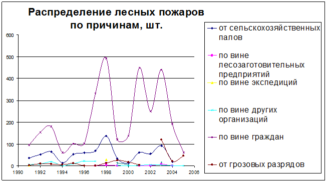 На весенний пожароопасный период приходится до 70 – 75% случаев лесных пожаров, и до 45% их площади. Как правило, лесные пожары в этот период имеют место в лесах южной и центральной частях края в непосредственной близости от населенных пунктов, путей наземного транспорта и носят четко выраженный антропогенный характер. Причинами всех лесных пожаров в этот период являются неосторожное обращение с огнем в лесу граждан, сельхозпалы и переход огня с территорий находящихся в ведении иных ведомств и организаций. (График распределения лесных пожаров по причинам рис. 1)