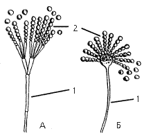 По формам Penicillium и Aspergillus легко отличить друг от друга (рис 1). У Penicillium конидиеносец многоклеточный, ветвящийся, цепочки конидия образуют фигуру в виде кисти, за что этот род получил название «гриб-кистевик». У Aspergillus конидиеносцы неклеточные, расширенные в верхней части, а цепочки конидий ассоциируются со струями воды, льющимися из лейки, почему его называют «леечный гриб».