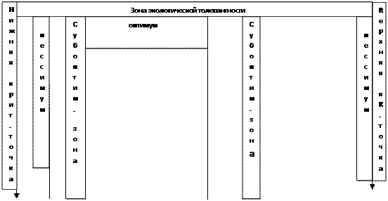 Благоприятная сила воздействия называется зоной оптимума экологического фактора или просто оптимумом для организмов данного вида. Чем сильнее отклонения от оптимума, тем больше выражено угнетающее действие данного фактора на организмы ( зона пессимума). Максимально и минимально переносимые значения фактора- это критические точки, за пределами которых существование уже невозможно, наступает смерть. Условия, приближающиеся по одному или сразу нескольким факторам к критическим точка, называют экстремальными. Пределы выносливости между критическими точками называют экологической валентностью живых существ по отношению к конкретному фактору среды. Экологическая валентность- свойство видов адаптироваться к тому или иному диапазону факторов среды. Чем шире диапазон колебаний экофактора, в которых данный вид может существовать, тем больше его экологическая валентноть (пластичность). Диапазон между минимумом и максимумом экофакторов- предел или диапазон толерантности. Сумма эковалентностей по отношению к отдельным факторам среды составляет экологический спектр вида.