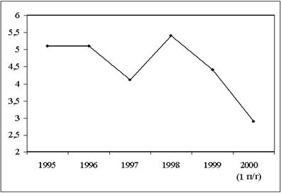 Рис 1.1.Снижение образования отходов металлокорда (в %) по отношению к использованному количеству металлокорда.