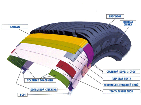 металлокорда и текстиля. Срок службы шины в большинстве случаев зависит от резины. Асрок службы резины зависит от условий хранения и эксплуатации даже больше, чем от свойств резины.Средний срок эксплуатации шины 2 года.