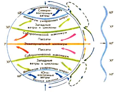 Распределение воздушных течений в земной поверхности имеет зональный характер. В экваториальных широтах - затишье или наблюдаются слабые переменных ветры. В тропической зоне господствуют пассаты. Пассаты - постоянные ветры, дующие от 30-х широт к экватору, имеющие в северном полушарии северо-восточное, в южном - юго-восточное направления. В 30-35? с. и ю.ш. - зона затишья, т.наз. «конские широты». В умеренных широтах преобладают западные ветры (в северном полушарии юго-западные, в южном - северо-западные). В полярных широтах дуют восточные (в северном полушарии северо-восточные, в южном - юго-восточные) ветры.