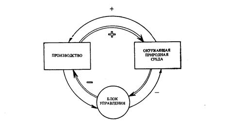 Производство воздействует на природные системы (положительная обратная связь). Эти воздействия (знак «плюс»), т.е. фактически управление, могут проявляться в извлечении природных ресурсов, размещении производственных отходов (загрязнении) и т. п. В свою очередь, окружающая среда также может влиять на предприятие (рис. 1). Подобные воздействия так или иначе могут привести к разрушению управляемой подсистемы, а следовательно, и всей эколого-экономической системы. Чтобы этого не происходило, необходимы компенсационные ответы со стороны управляемой подсистемы по отношению к управляющей через каналы отрицательной обратной связи (знак «минус»). Природные системы не располагают достаточным запасом информации для того, чтобы компенсировать влияние на них производства. Поэтому соответствующие функции управления должен брать на себя человек.