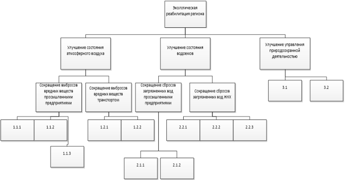 При создании территориальной природоохранной программы формируется набор мероприятий, реализация которых позволяет достичь поставленную цель по стабилизации или улучшению экологического состояния в рассматриваемом городе, области или районе. Анализ существующей практики формирования программ природопользования показывает, что мероприятия отбираются без специальной методике, в разрезе отдельных отраслевых и межотраслевых комплексов (по отдельным промышленным предприятиям разных отраслей, в коммунальной сфере, в области здравоохранения, в области социального обеспечения и т.д.). При этом не обращается внимания на то, что цель природоохранной программы распадается на подцели (например, снижение загрязнения по отдельным природным сферам атмосферному воздуху, водной среде, почве...). Необходимо рассматривать загрязнение первичных сред (атмосферного воздуха, водных бассейнов, почв). Их можно назвать первичными средами воздействия, а объекты воздействия - вторичными средами воздействия. И это приводит к тому, что набор мероприятий не удовлетворяет всему множеству подцелей и, соответственно, их реализация не даёт возможности достичь поставленной цели. Кроме того, в процессе формирования набора мероприятий не обращается внимание на объёмы вложений для их реализации и результат, который ожидается от реализации мероприятий указывается в натуральном выражении: сокращение выбросов вредных веществ и прочее. Эти результаты не обеспечивают соизмеримость для различных мероприятий, их нельзя сопоставить с затратами.