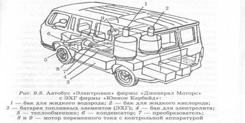В то же время технико-экономические оценки, которые были выполнены при условии промышленного производства водорода из пропана, выявили приемлемость электробусов, электрофургонов и электромобилей общего назначения с ЭХГ уже в настоящее время. Примером может служить 2-местный легковой электромобиль фирмы «Фольксваген» с ЭХГ, который имеет номинальную мощность 15 кВт, максимальную — 22,5 кВт и скорость 88,5 км/ч. Параллельно к ЭХГ подключена аккумуляторная батарея энергоемкостью 3 кВт-ч для работы в пиковых нагрузках и для приема энергии рекуперативного торможения. Топливные элементы, которые входят в батарею ЭХГ фосфорнокислого типа, работают на смеси воды с метанолом и характеризуются плотностью тока 1300 А/м2 при напряжении 0,6 В.