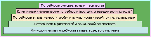 Существует иерархия потребностей от чисто биологических, первичных, таких как потребности в пище, воде и кислороде, без чего не возможно поддержание жизни, до утонченной потребности в самореализации, которая возникает в качестве завершающей на самом верхнем их уровне. Ее можно представить в форме пирамиды (рис. 1).