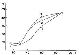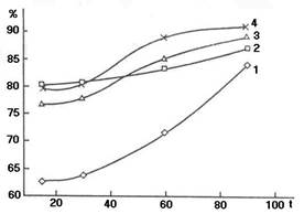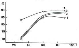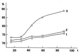 Из анализа зависимости степени очистки от времени (рис. 2) видно, что с повышением температуры и избытка гипохлоритов наблюдается увеличение степени очистки.