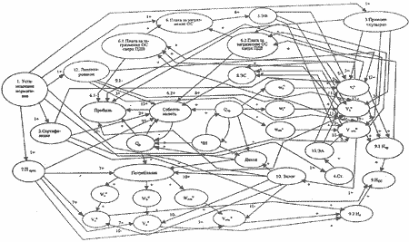 Построенная модель позволяет провести анализ взаимодействия показателей, выявить влияние показателей с помощью присвоения знака плюс или минус дуге. В базовой модели знак плюс присвоен дуге (i, j) при условии, если увеличение показателя i повлечет за собой увеличение показателя j, т.е. между ними имеется прямо пропорциональная зависимость. Знак минус присваивается дуге (i, j) в том случае, если при увеличении показателя i показатель j будет уменьшаться, т.е. между показателями имеется обратно пропорциональная зависимость.