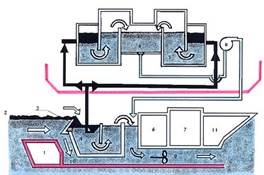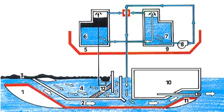 Большинство этих скиммеров по принципу действия являются также пороговыми. Гидродинамические скиммеры основаны на использовании центробежных сил для разделения жидкости различной плотности - воды и нефти. К этой группе скиммеров также условно можно отнести устройство, использующее в качестве привода отдельных узлов рабочую воду, подаваемую под давлением гидротурбинам, вращающим нефтеоткачивающие насосы и насосы понижения уровня за порогом, либо гидроэжекторам, осуществляющим ва-куумирование отдельных полостей. Как правило, в этих нефтесборных устройствах также используются узлы порогового типа.