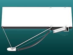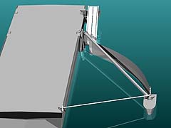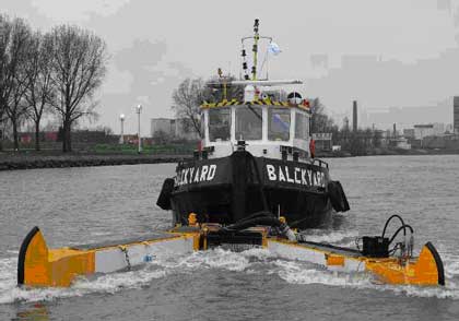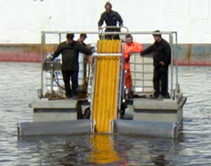 Кроме того, его можно использовать в различных положениях и комбинациях – перед судном-сборщиком, у его борта, с понтоном или боновым заграждением. Испытания показали, что наилучшими параметрами, обеспечивающими качественную зачистку, являются угол раствора 120 градусов при скорости 3.5 узла. Система исполняется в нескольких вариантах, от стальной конструкции длиной 11 метров, шириной сбора 3.7 метра и высотой 1.5 метра, до небольшой аллюминиевой длиной 4 метра. К нефтесборщику прилагается набор из нескольких сьемных типов нефтесобирающих устройств (ловушка, щетки, пояса - weir, brush, belt). Складывающийся Victory Oil Sweeper удобен в экслпуатации и перевозке.